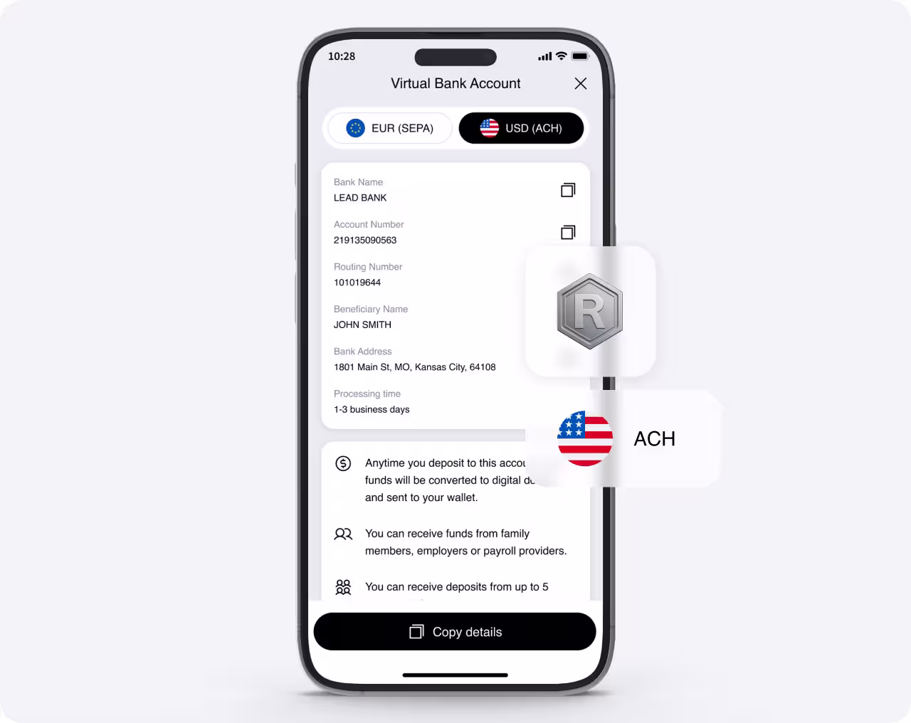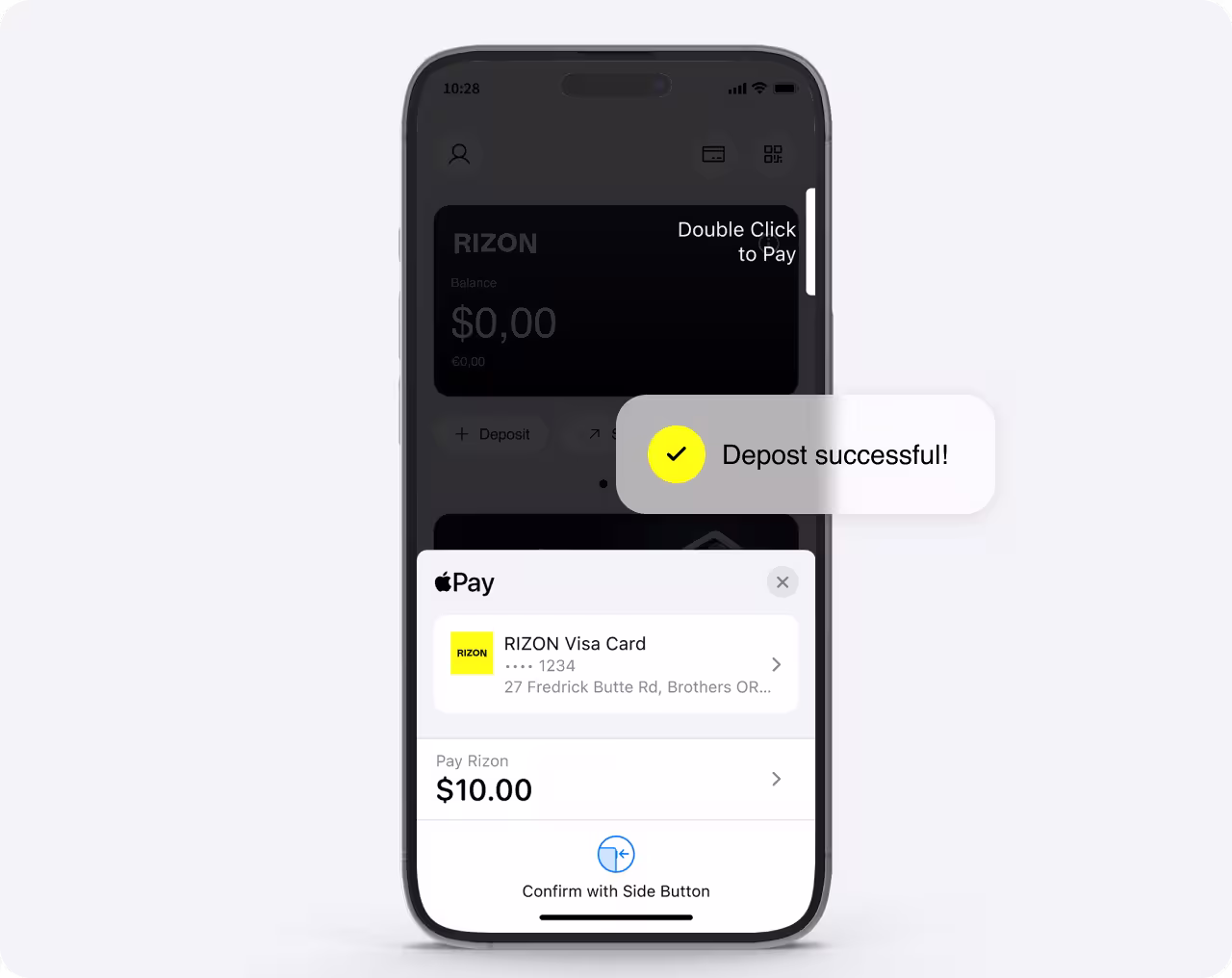 Link your bank and move money straight into Rizon. ACH is great for bigger top-ups at low cost. We'll show the status in real time; funds clear once your bank processes the transfer.