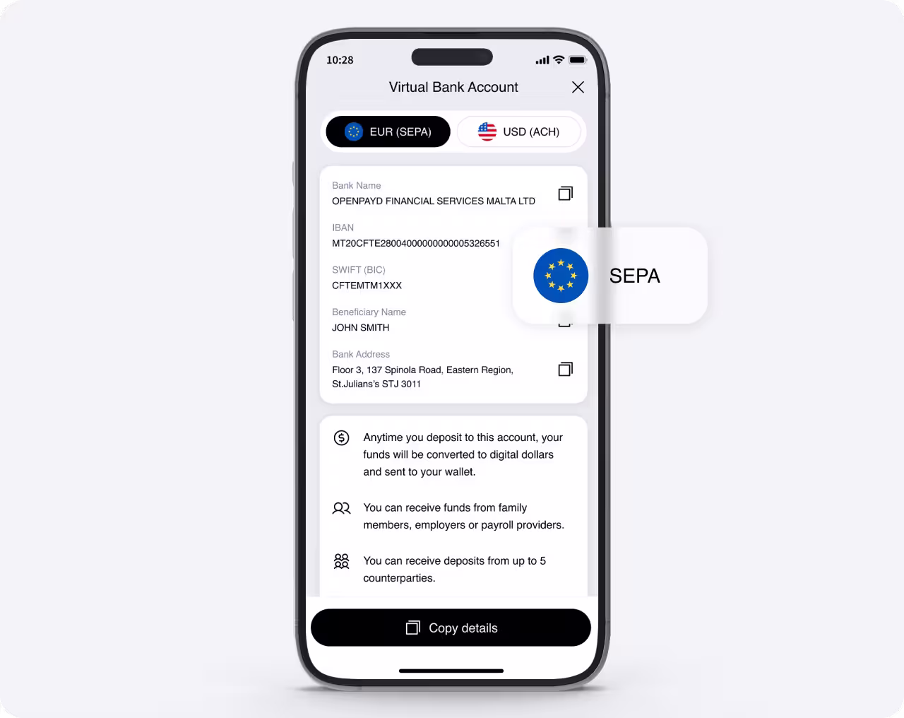Send a domestic wire before your bank's cutoff and we'll credit it the same business day. For international (SWIFT), expect quick processing with transparent tracking.