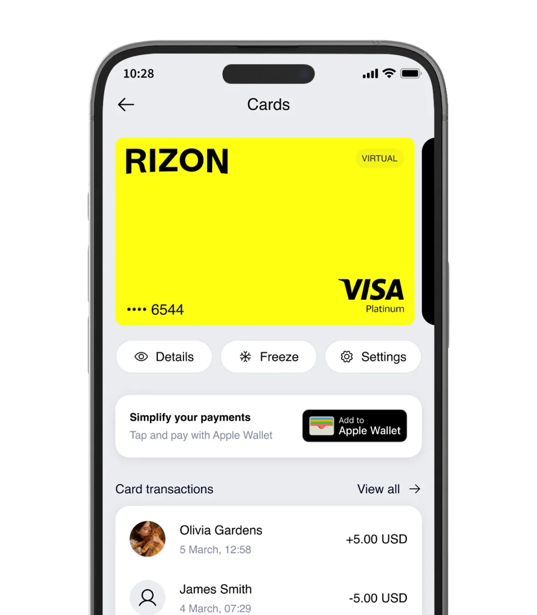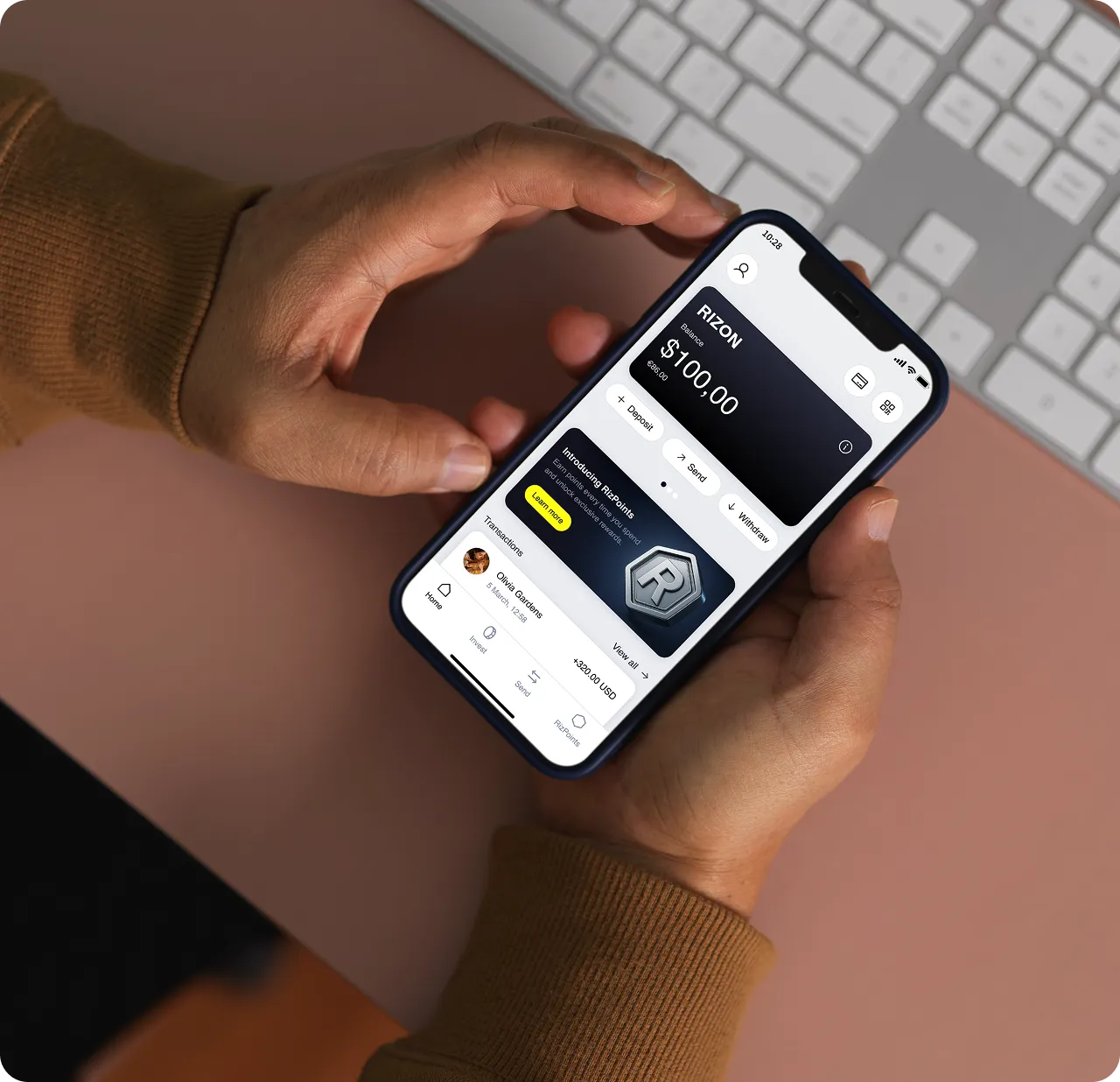 Rizon is non-custodial, you keep full control of your funds. Visa-grade security, biometric login, and smart fraud protection built-in.